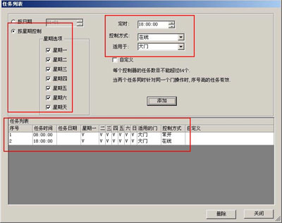 進(jìn)行定時(shí)任務(wù)設(shè)置,添加兩個(gè)定時(shí)任務(wù),設(shè)置完畢后 到 [總控制臺(tái)] 上傳設(shè)置,注意上傳完畢后,由于還沒(méi)有到啟動(dòng)定時(shí)任務(wù)的時(shí)間,所以門(mén)的系統(tǒng)還是保持在線狀態(tài).