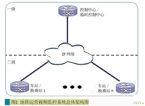 其中運營視頻監控系統為二級架構,在車站/換乘站設立二級監控中心,負責監控本站相關情況,在控制/備用中心設立一級監控中心,負責整個線路的遠程監控,架構示意如圖1所示。
