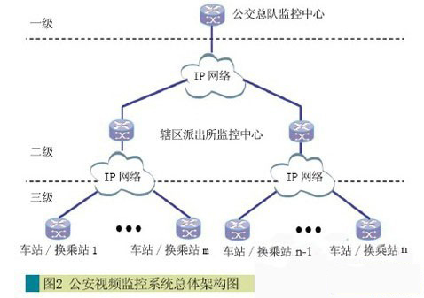 公安視頻監控系統為三級架構,在車站/換乘站公安值班室設立三級監控中心,負責監控本站相關情況,在派出所設立二級監控中心,負責監控轄區所在車站/換乘站相關情況,在公交總隊設立一級監控中心,負責整個線路的遠程監控,架構示意如圖2所示。